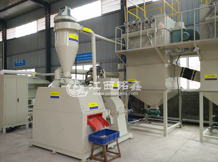 設備采取了干式破碎、粉碎,使廢舊電路板成為金屬和樹脂纖維末混合物,然后通過風壓分離器將金屬與樹脂等非金屬分離的工藝路線。設備優點,噪音小、無需水、無粉塵污染、節約動力,節約人力、絕無廢棄物,金屬及非金屬95%以上充分回收利用。為防止加工過程中的粉塵污染,設備采用三合一除塵裝置,除塵裝置共有三級除塵:旋風除塵和兩級布袋除塵,有效地解決了粉塵污染問題,各項指標均達國家標準。