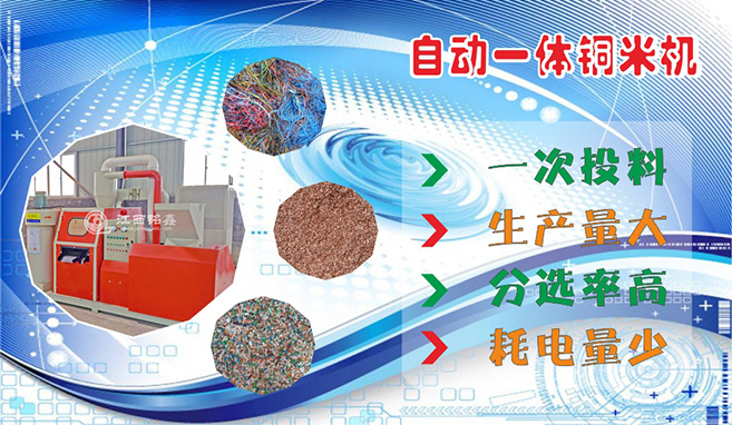 全自動銅米機是專業干式分離廢舊電線電纜的生產線。例如:舊汽車電路線,通訊電纜線,以及剝線機不適合加工(各種民用電線)廢舊雜料電線.毛絲細線等.此機的特點是大小線不用分類可以同時破碎分離,結構新型,生產量大,耗電少。分選率高,一次投料,多機協作完成。全線由PLC控制,在國內處于領先水平。該機的開發成功,即解決了焚燒取銅方法中出現的問題,又能提高回收銅的質量,并可將塑料回收利用,同時解決環境的污染。